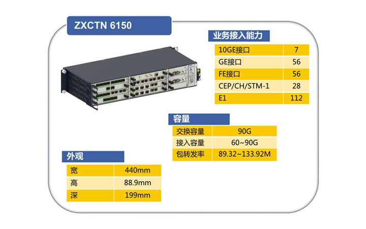 ZXCTN 6150产品应需而生,致力于为行业用户以及运营商打造一张高效、节能的承载精品网,全面提高网络核心竞争力,助力行业用户以及运营商拓展市场和进行业务创新。ZXCTN 6150提供了10GE/GE/FE/STM-1/E1等丰富的业务接口,全面涵盖了2G、3G、LTE、大客户业务的传送需求,兼顾现网和未来的业务需求;具备超强的多场景适用性,降低维护的复杂度,提升运维效率。
